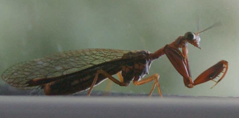 I recently found this little fellow in my house; he possibly came in with a load of wood for the fire. This is a mantispid and in many ways it looks like a praying mantis. But you have to go back nearly 300 million years to find the common ancestor of the praying mantis and mantispid. So the distinct triangular head and the pair of grasping front legs evolved separately in these species - a wonderful example of convergent evolution.